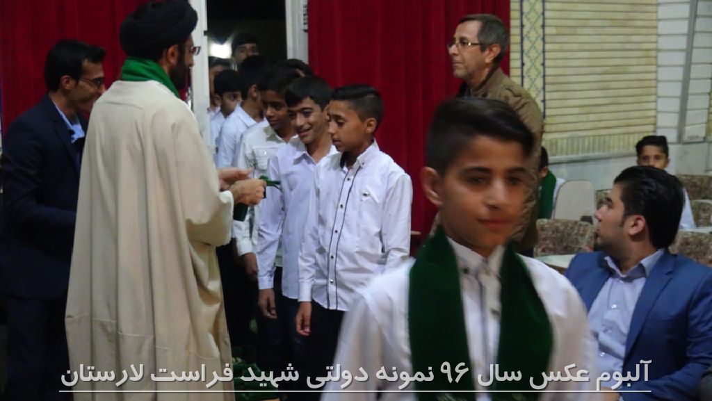 دانش آموزان با نظم وارد سالن شده آقای مومن شال سبزرنگ را بر گردن آنها می آویخت.